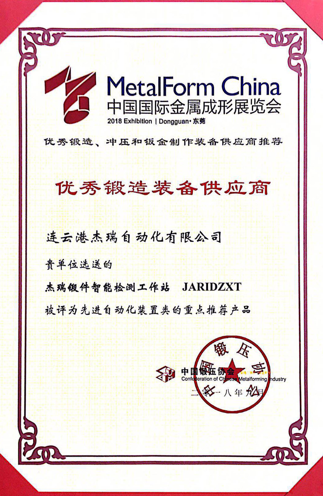 杰瑞自動(dòng)化公司最新裝備“鍛件智能檢測(cè)工作站”以其超前的多規(guī)格鍛件在線檢測(cè)技術(shù),再次引領(lǐng)智能鍛造技術(shù)發(fā)展新潮流,一經(jīng)亮相展會(huì),星光璀璨,脫穎而出,一舉摘得“先進(jìn)自動(dòng)化裝置類的重點(diǎn)推薦產(chǎn)品”,并助公司再次斬獲“優(yōu)秀鍛造裝備供應(yīng)商”殊榮。